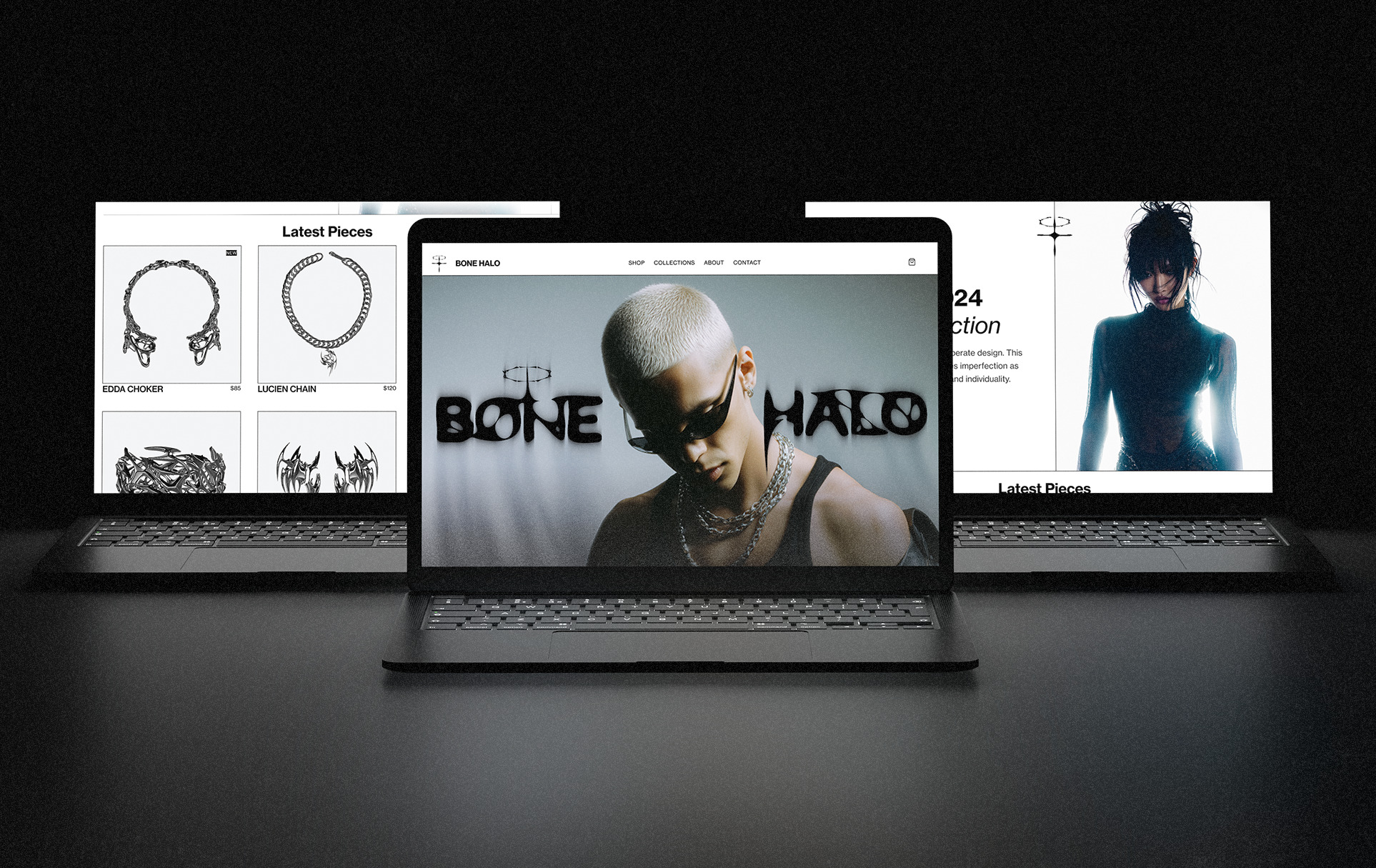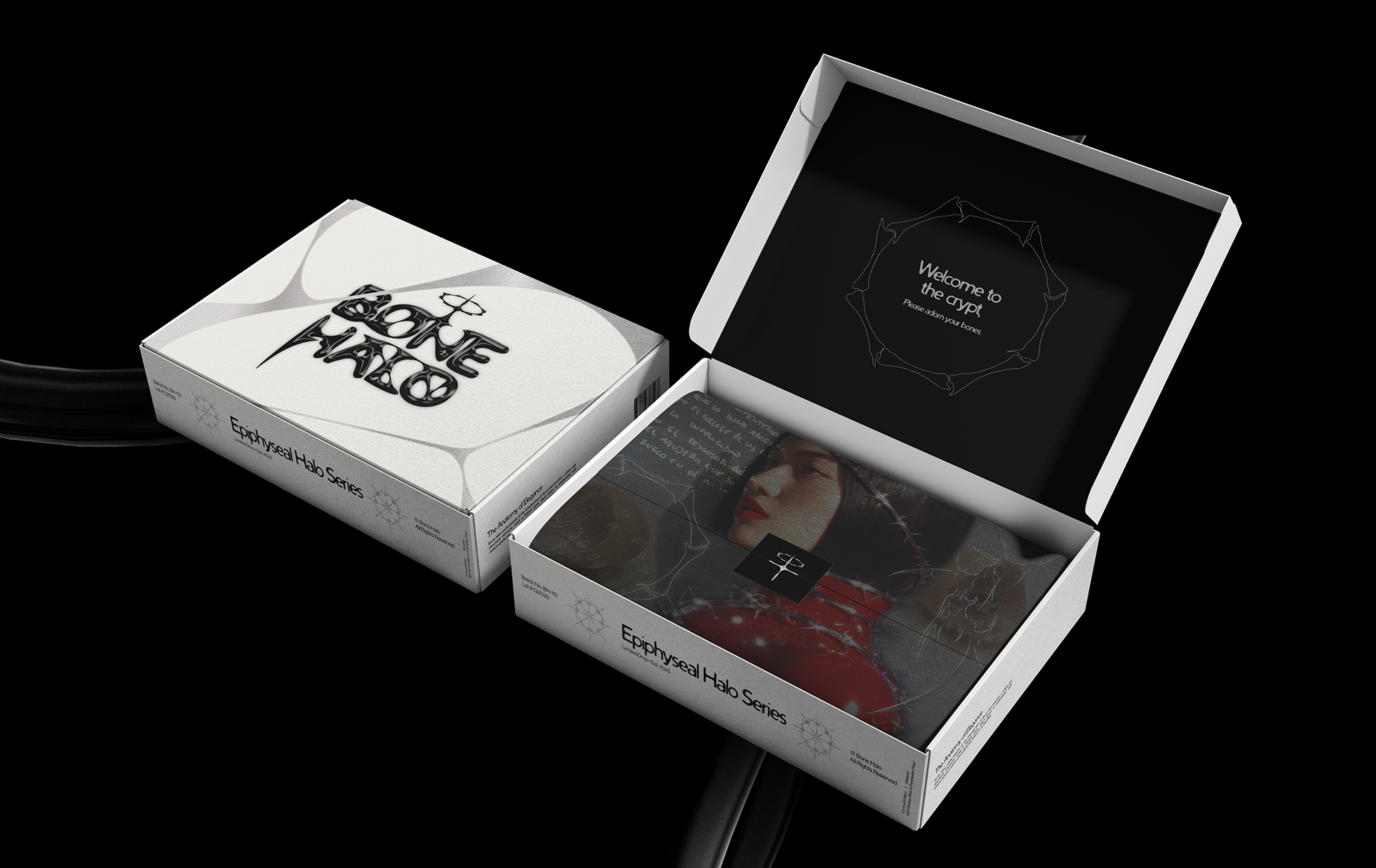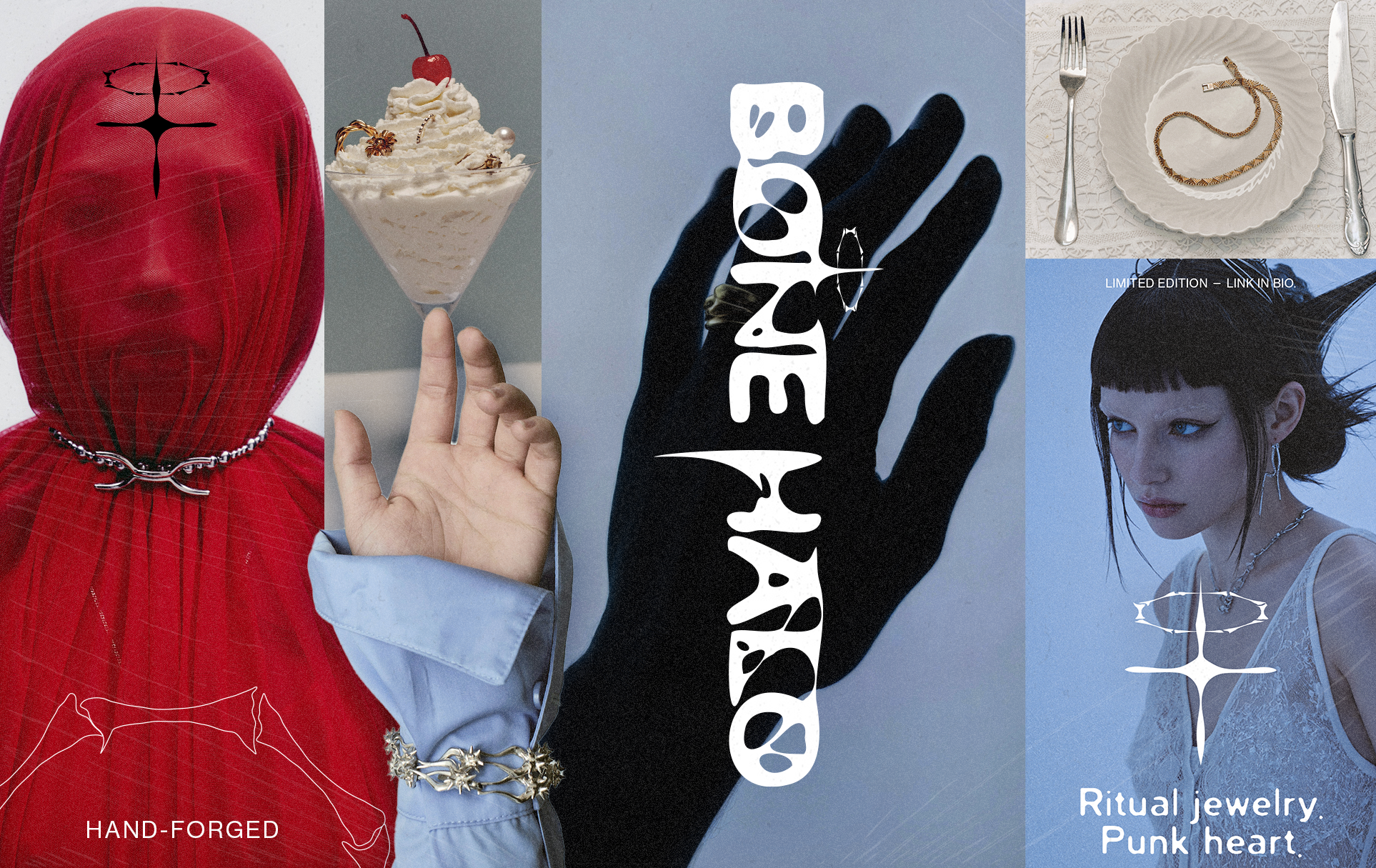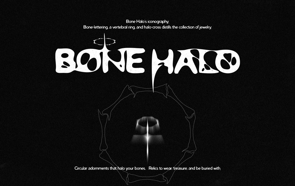 I kept looking for jewelry that matched the aesthetic I actually wanted to wear. Alternative, textured, a little polarizing, without the luxury markup. I couldn't find it, so I built the brand myself. Bone Halo is a self-initiated project and full identity. It's the brand I wanted to buy from, designed in a style I've always wanted to utilize.