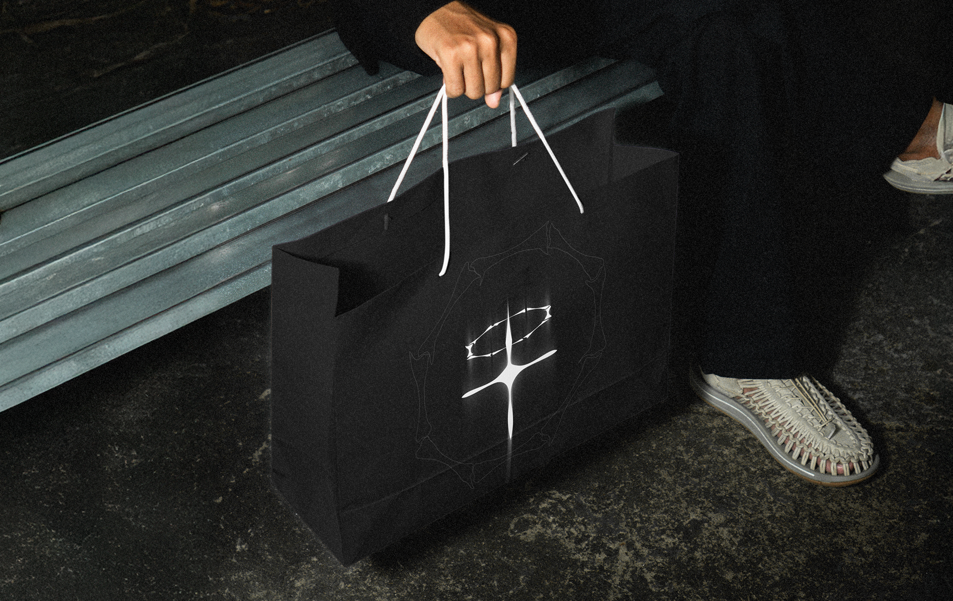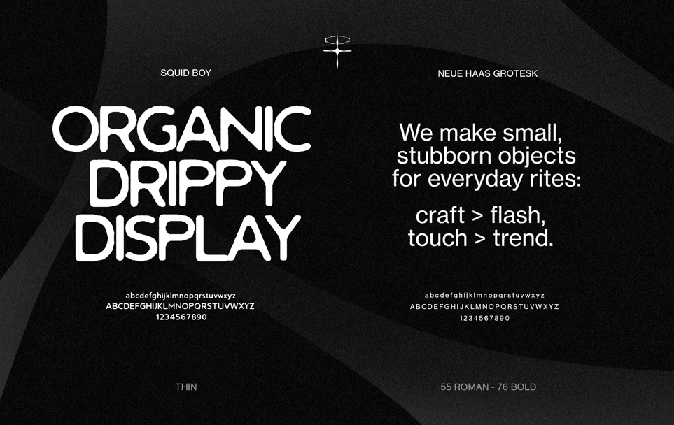 Custom bone-inspired lettering, halo-cross icon built to distill the collection into a single visual language. Paired Squid Boy, an organic, drippy display face, with Neue Haas Grotesk to balance texture with readability.